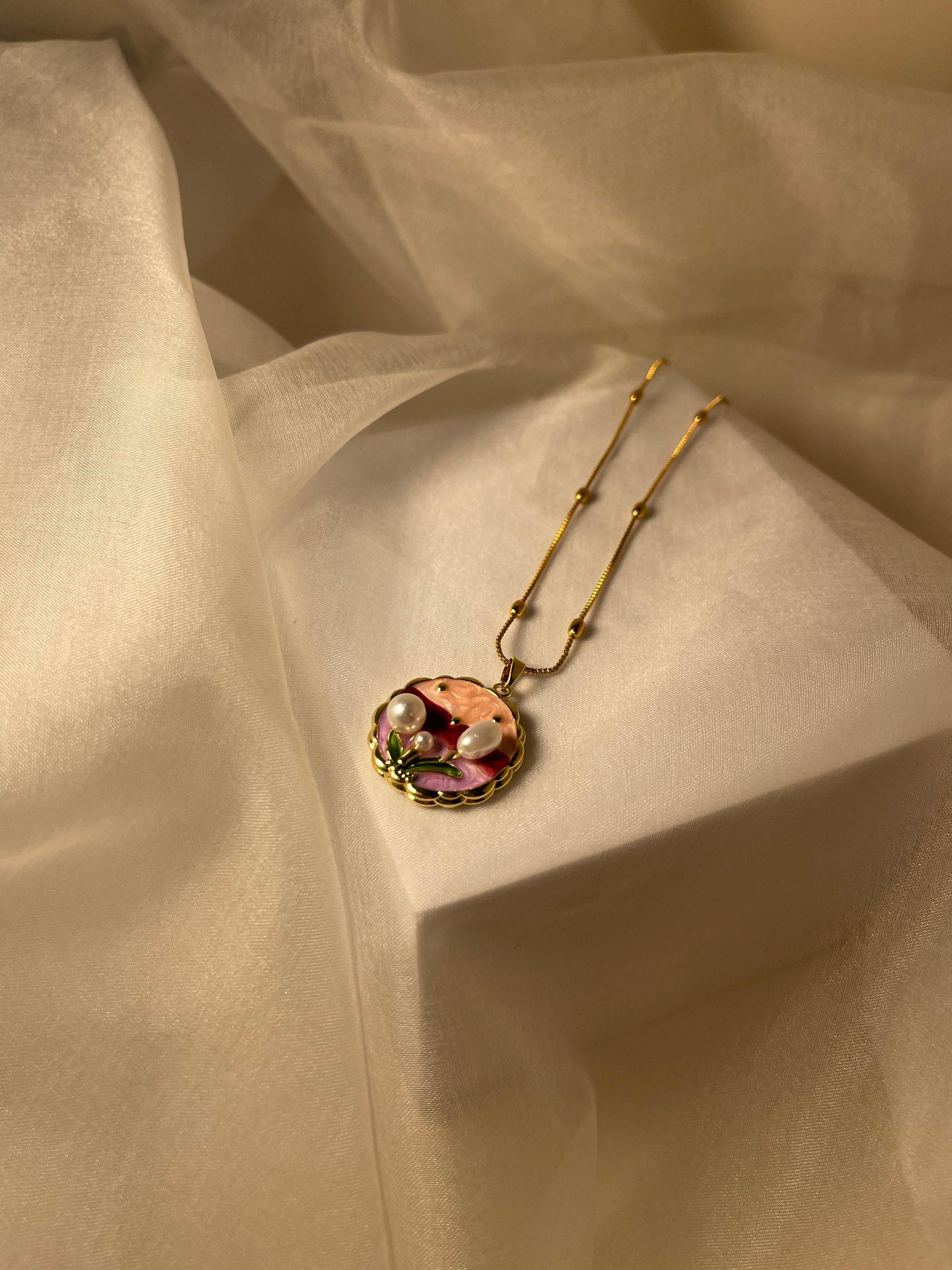 Elevate your ensemble with this enamel pearl necklace adorned with delicate white flower accents. Its refined design combines the timeless elegance of pearls with subtle floral artistry, making it a perfect accessory for sophisticated occasions or to add a graceful touch to your everyday style.
