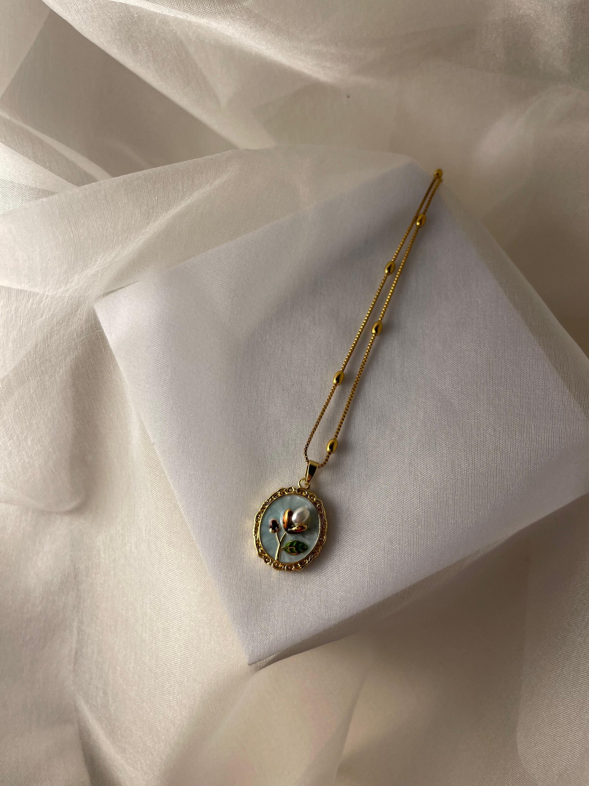Elevate your ensemble with this enamel pearl necklace adorned with delicate white flower accents. Its refined design combines the timeless elegance of pearls with subtle floral artistry, making it a perfect accessory for sophisticated occasions or to add a graceful touch to your everyday style.