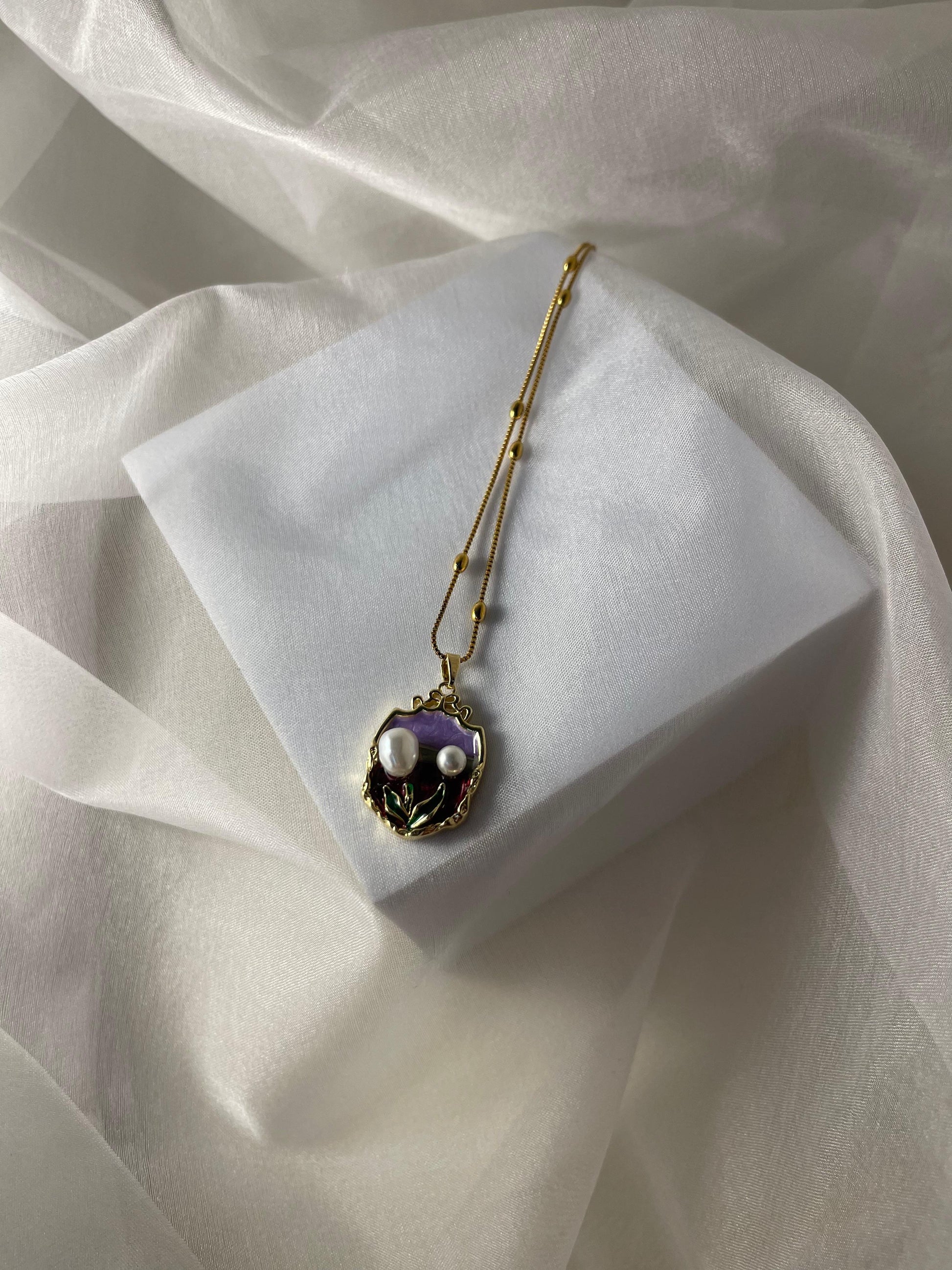 Elevate your ensemble with this enamel pearl necklace adorned with delicate white flower accents. Its refined design combines the timeless elegance of pearls with subtle floral artistry, making it a perfect accessory for sophisticated occasions or to add a graceful touch to your everyday style.