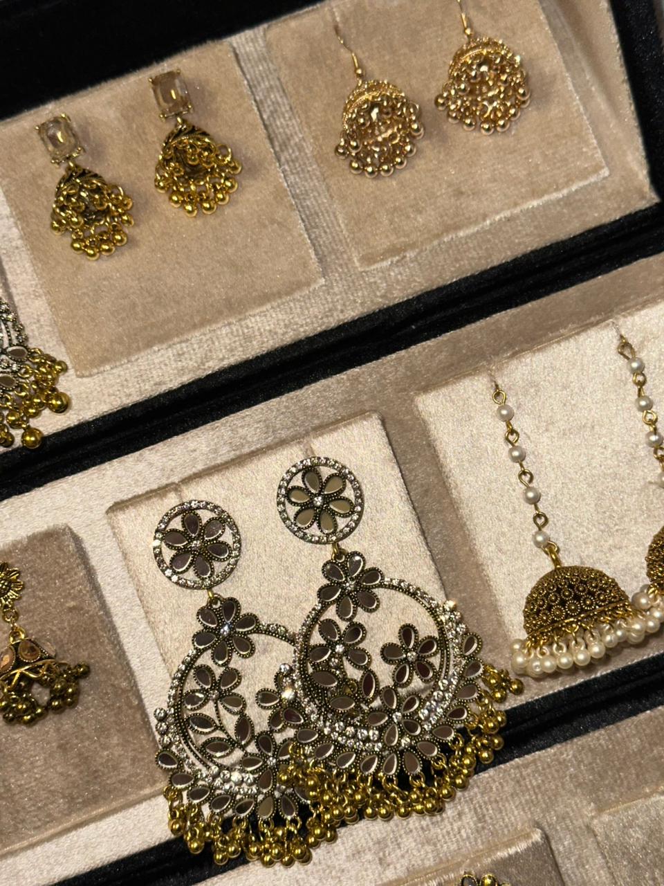 Gold Jhumka Box Elevate your jewelry collection with this refined Gold Jhumka Box—a sophisticated storage solution designed for the discerning jewelry enthusiast. Crafted to protect and showcase your most treasured jhumkas, this box combines elegant aesthetics with practical functionality. The luxurious finish complements any vanity or dressing space, while the secure interior keeps your pieces organized and pristine. Perfect for gifting or personal indulgence, it's an essential accessory for those who appreciate both beauty and craftsmanship.