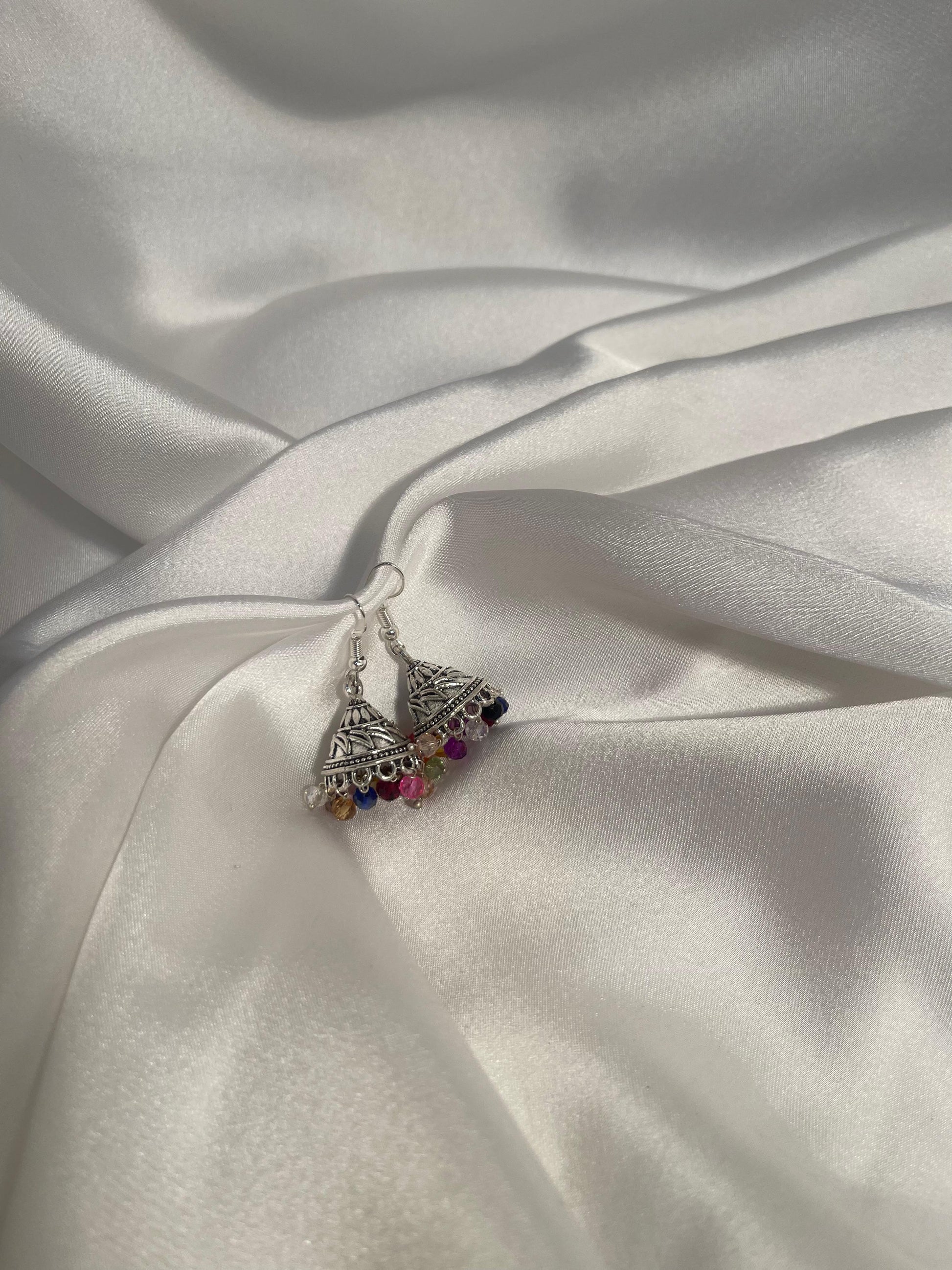 Elevate your ethnic ensemble with these exquisite silver jhumkis, meticulously crafted with an array of vibrant multi-colored beads. Each pair features traditional bell-shaped design paired with contemporary bead detailing, creating a sophisticated balance between heritage and modern elegance. The lustrous silver finish complements the colorful accents, making these versatile earrings perfect for festive occasions, weddings, or everyday luxury wear. Lightweight construction ensures all-day comfort without compromising on visual impact. A timeless addition to any jewelry collection.