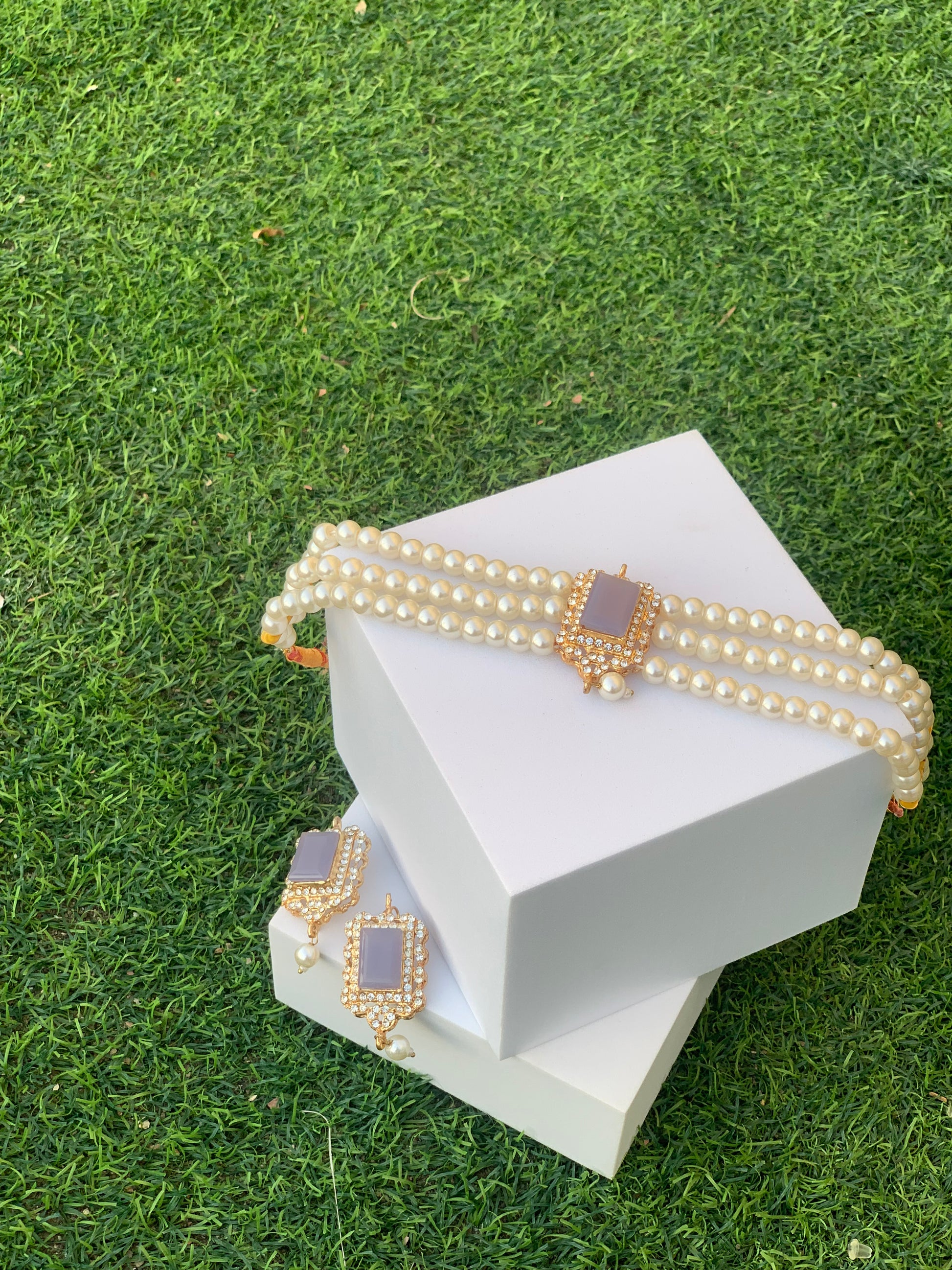 Moti Choker with earrings - Muted Purple (Lavender tone)