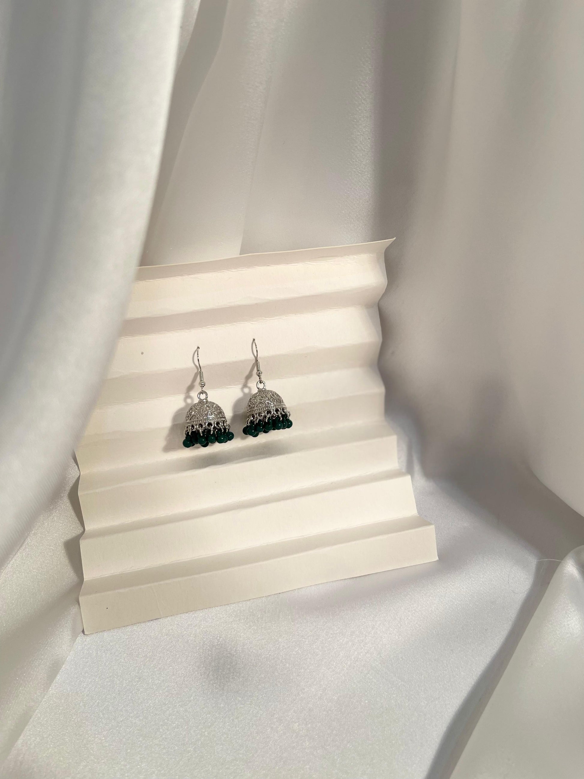 Tania Silver Jhumki ( Green beads)