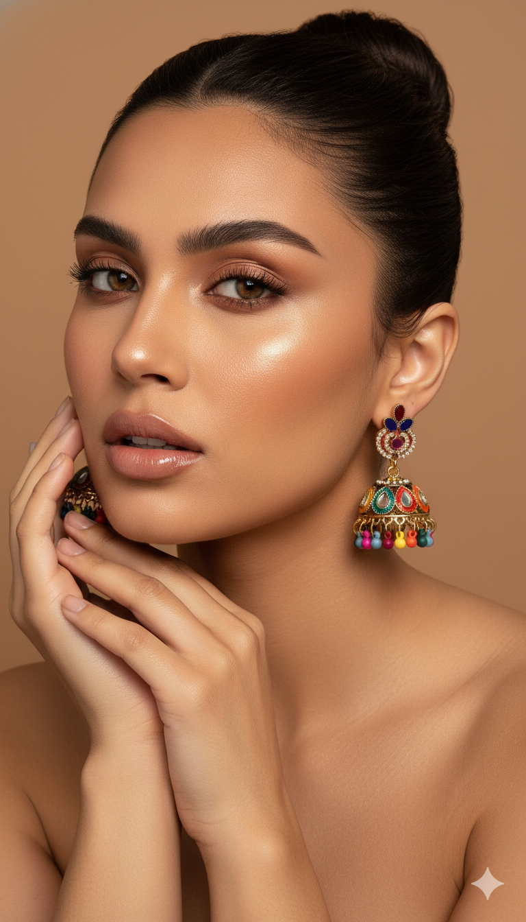 Teen Booti earrings are a beautiful way to celebrate tradition while staying comfortable throughout your day. Their lightweight design ensures you can wear them for hours without any discomfort. Whether you're dressing up for a special occasion or adding elegance to your everyday look, these jhumkis support your style with a touch of timeless charm.